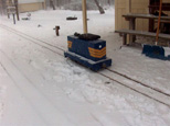 Fearlessly the snowman stood his ground facing the oncoming doom(The next picture was censored). Bill Bodeman approaches the track and wants to know "Anyone for more?". |