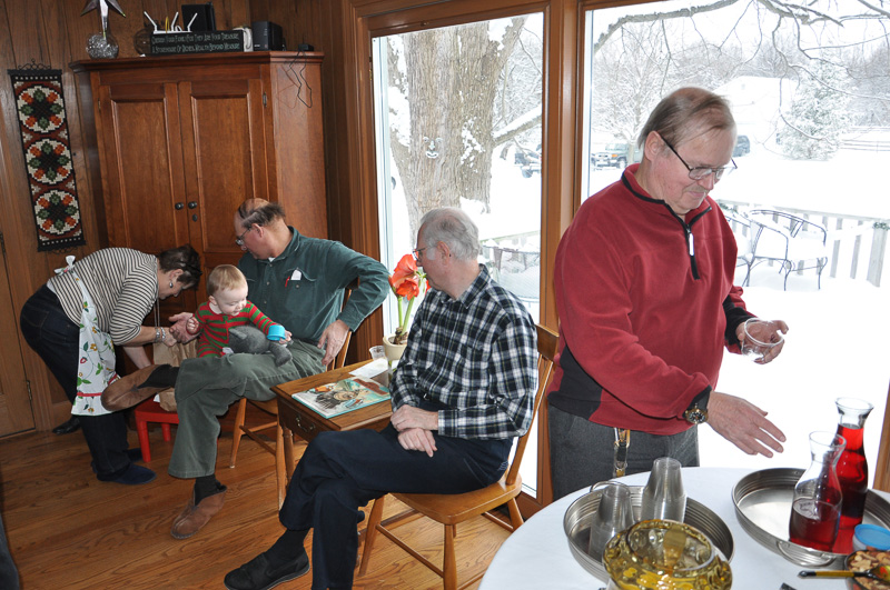 Kathy and Karl Losely with the youngster as Ron Trenhaile watches and Rick Nagy getting more refreshment. Mike Uhrich, our host and chef, helps serve as the group files through filling their plates. |