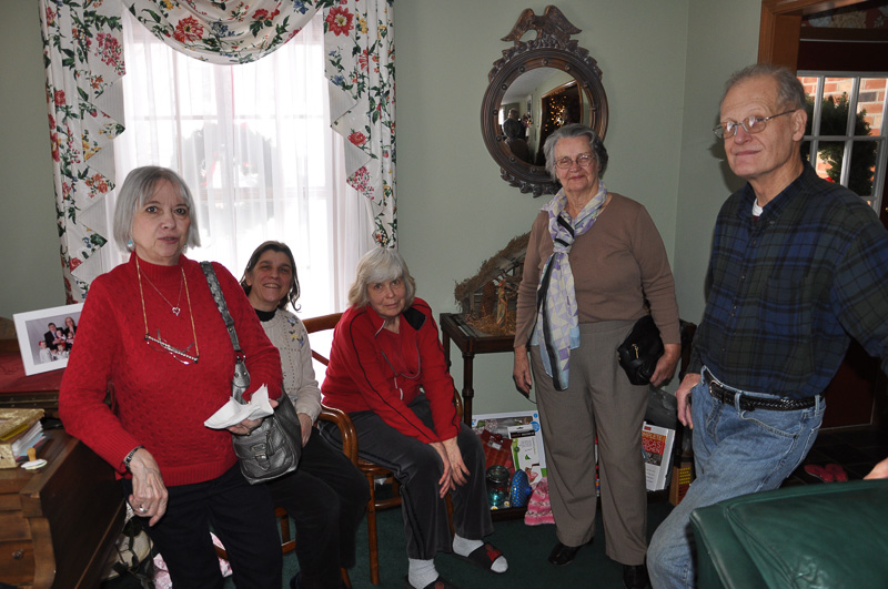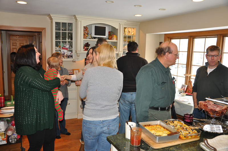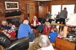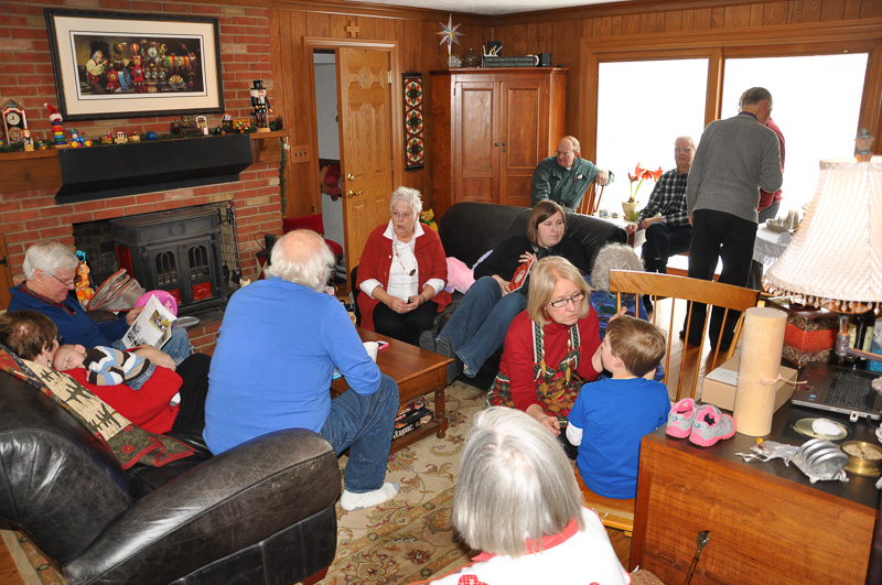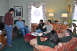 A view of the activity going on in the family room where conversations abound. Pam seems to have the attention of the group at the table. |