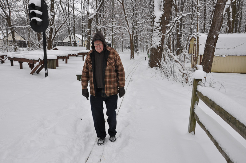 Marty had it radio controlled but it had an affinity for climbing the rail in the snow and derailing by the switch just past the station. Dick Clark all bundled up against the cold as he walks back towards the station. |