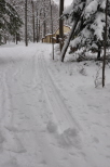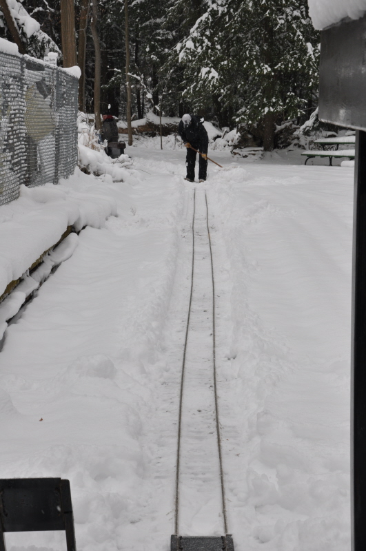 Mike Harkleroad using the clubs GP38 tries to push his way up the grade out of the yard towards the main as Ron continues sweeping the track at the yard switch. A view of the yard area with the snow-covered track and heavily laden branches covered with snow. |