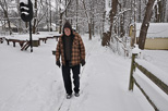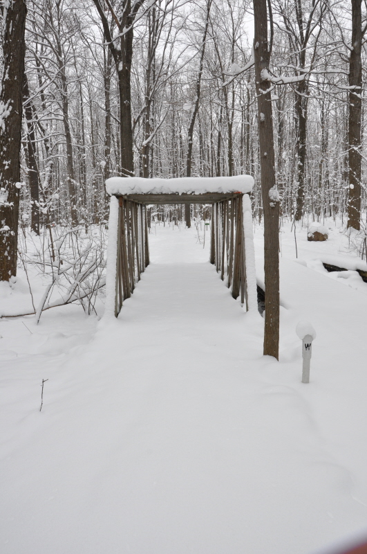 The snow laden branches provided a canopy over the track but hung much closer to the top of the rail because of the load. The Truss Bridge stood out in starkness from the white blanket that covered the surrounding the area. |