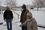 The young man, bundled against the cold, watches as the engine rolls by and will shortly be in front of the station. Paul Emch, Ron Malinowski, Dick Clark and Mike Harkleroad watch the action at the station as the snow continues to fall. |