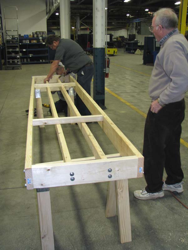 Ken measuring along the frame and marking a line every four inches for the tie spacing. Ken, George and Ted fasten down the tie spacers to the work table. |