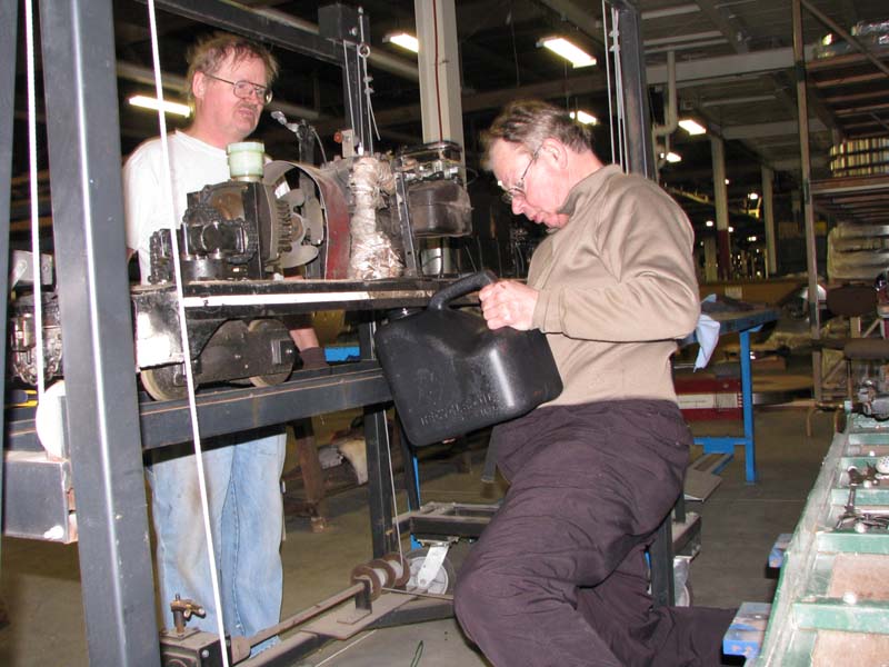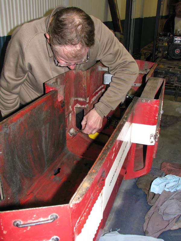 While this was going on Dave was helping Frank Foti who was drilling out some bolts holding the boiler to the smoke box. Joe was trouble shooting the wiring in the shell of the work engine for the lights. |
