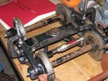 Dick Clark brought in a swing frame truck so that we can compare clearances for brake rigging that a conventional truck with brakes have. Dave Foster added this set of brakes with cast iron shoes to an old set of trucks from one of our rider cars. |