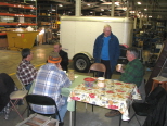 Wayne Boron, Dave Hird, Bonnie Zaken and Paul Zorko enjoys a good laugh while Dave Foster works on the club's gondola car at our winter work session at Hose Master. Bonnie has been making lunches for the guys and here Rick Nagy is filling his plate as the two pose for the cameraman. |