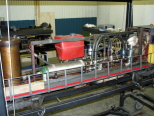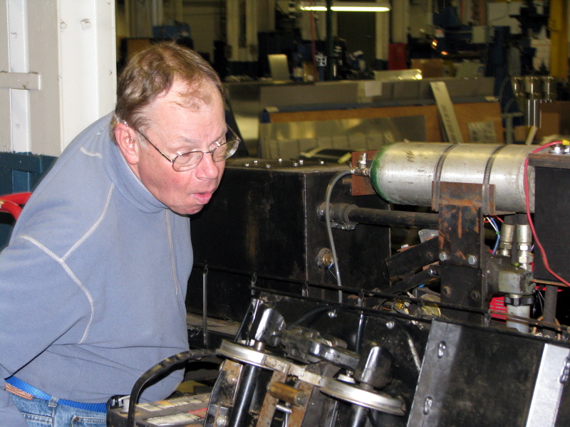 Here we catch Frank Foti doing a little maintenance by changing the oil on East Wind from the oil pan and then he'll check the gap on the spark plugs. Bill Deptowicz is checking out the tubing of the air lines on the riding car for any possible wear. |