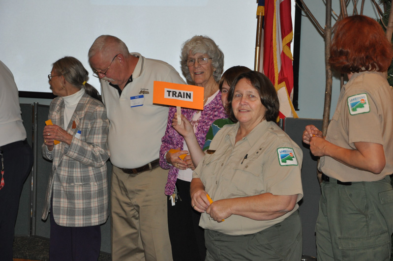The 1st group that had the word train were given an empty 16 ounce plastic bottle to blow in for a whistle. The 2nd group that had Lake Metroparks were to chant together welcome to Lake Metroparks, etc. when they heard those 2 words. |