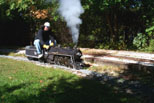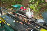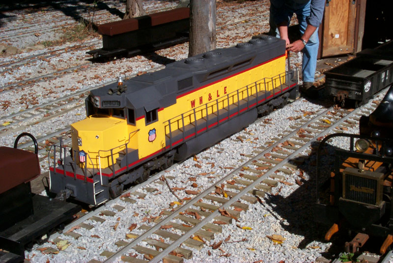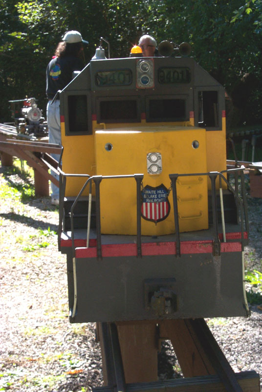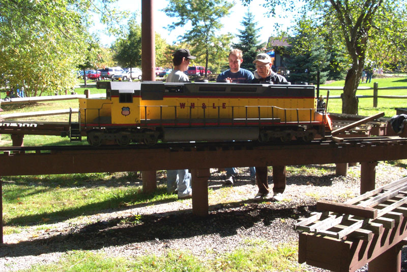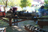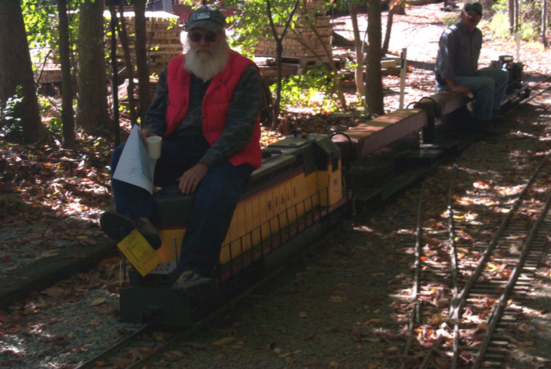 Jon on the WH & LE engine for a checkout run, minus the cab's sheet metal, at Patty's Rock Bridge. Don Spiedel with his Conrail engine and one of the first load of passengers of the public run. |