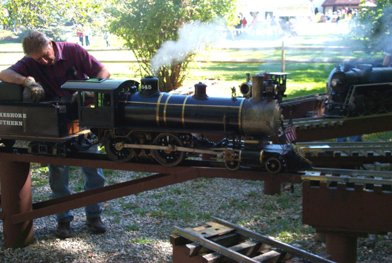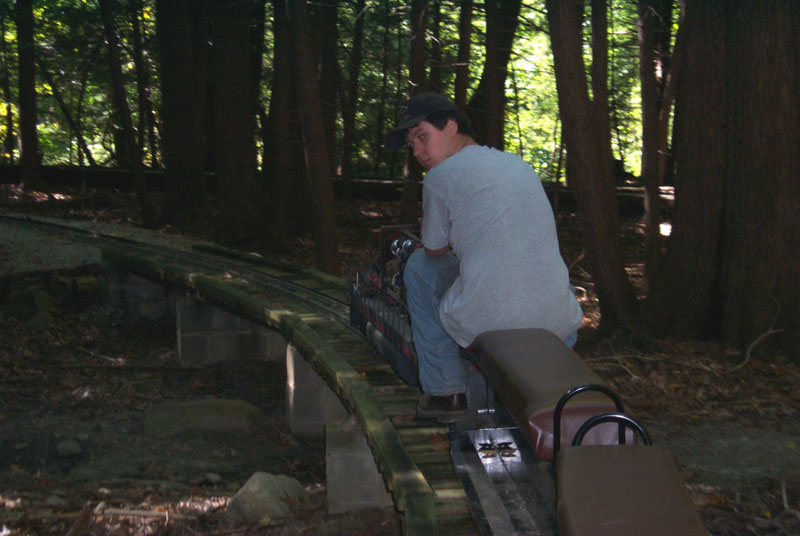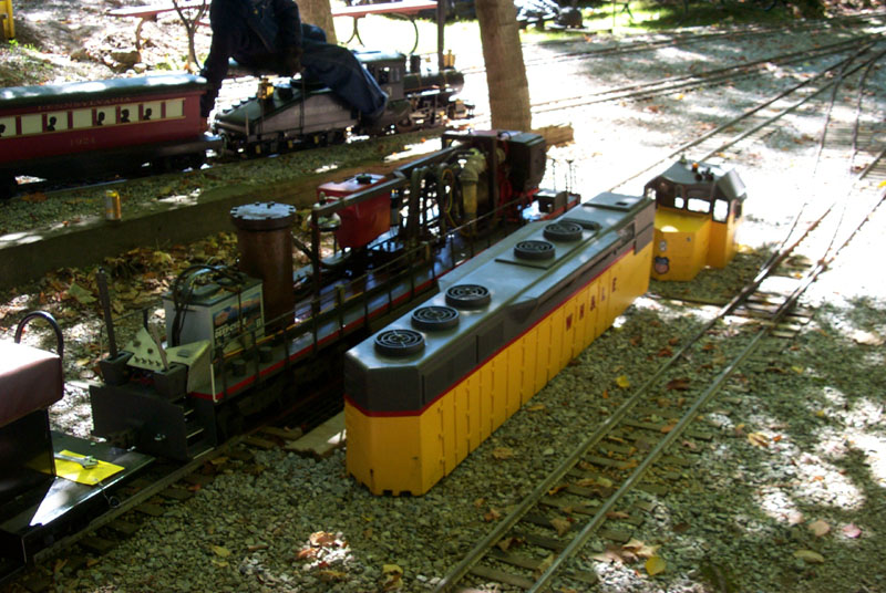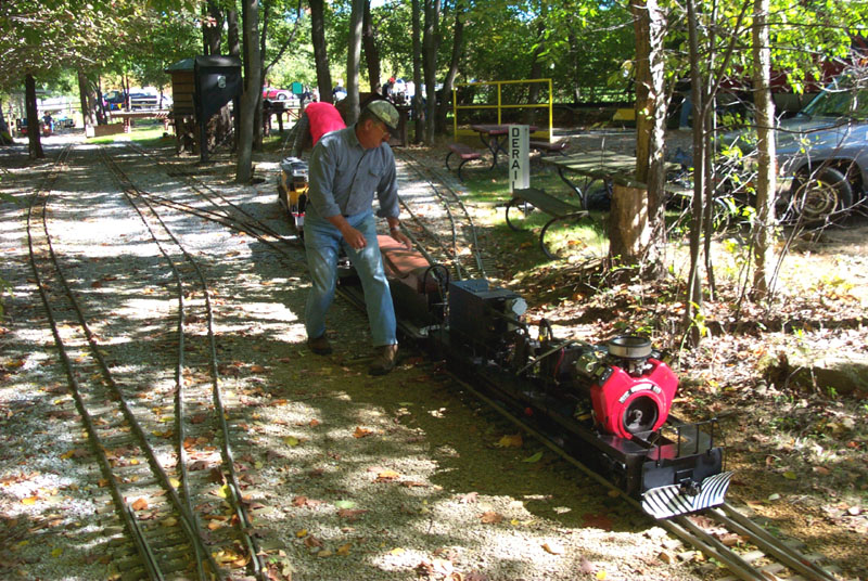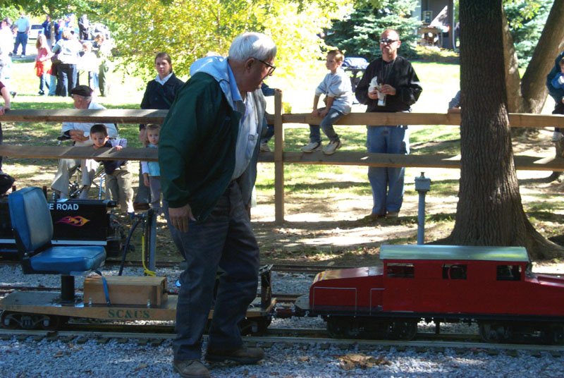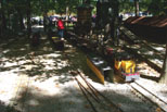 Frank approaches the crossing for the "Orchard Yard". George Davidson getting his electric cab ready to pull out on the main line and take passengers around the track. |