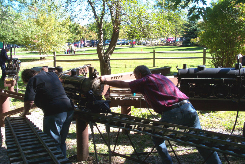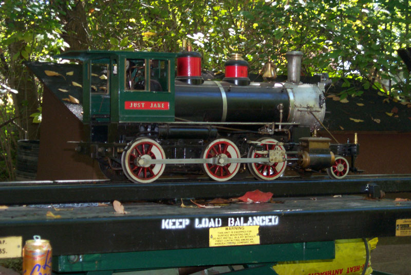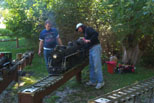 Robbi Haines and Roger Harnish push his American on to the turntable. George Davidson's little engine on the new lift waiting to go into the steaming bay for a boiler pressure test. |