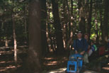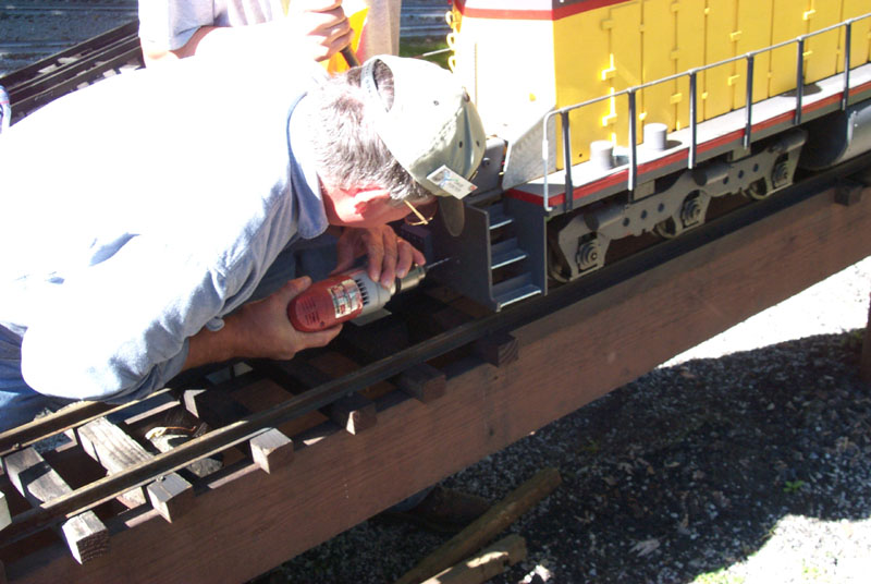 Head on shot of the WH & LE engine 9401 (new in Jan. 1994?) Dave drilling the front plate for a U bolt for the safety chain. |