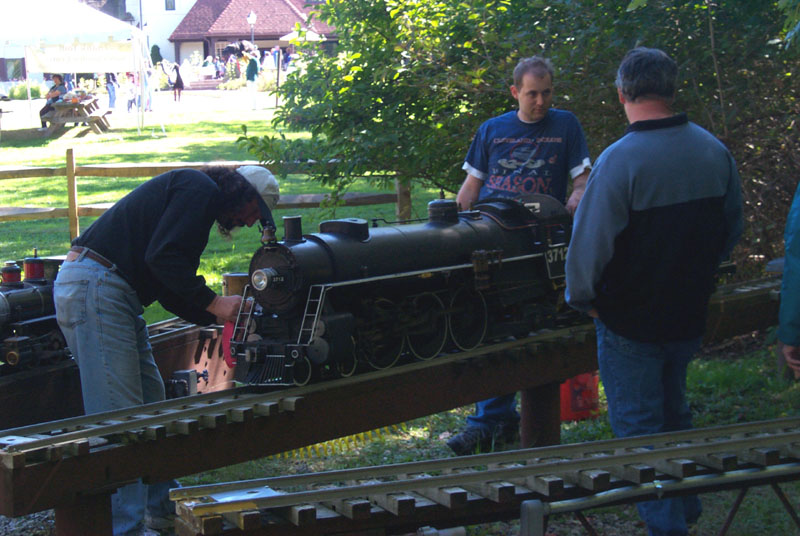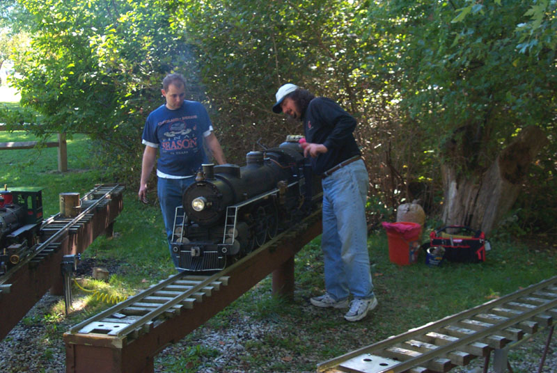 Roger checking things out and prepares to move to the main line. Frank lubricates the engine while Kevin discusses the engine. |
