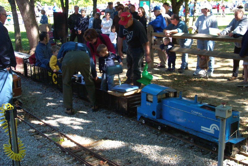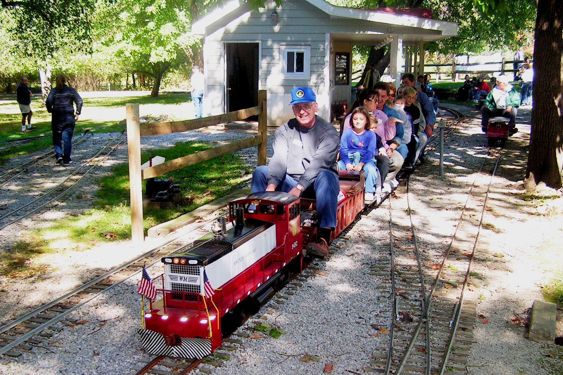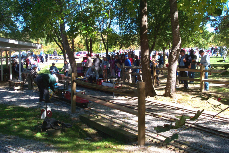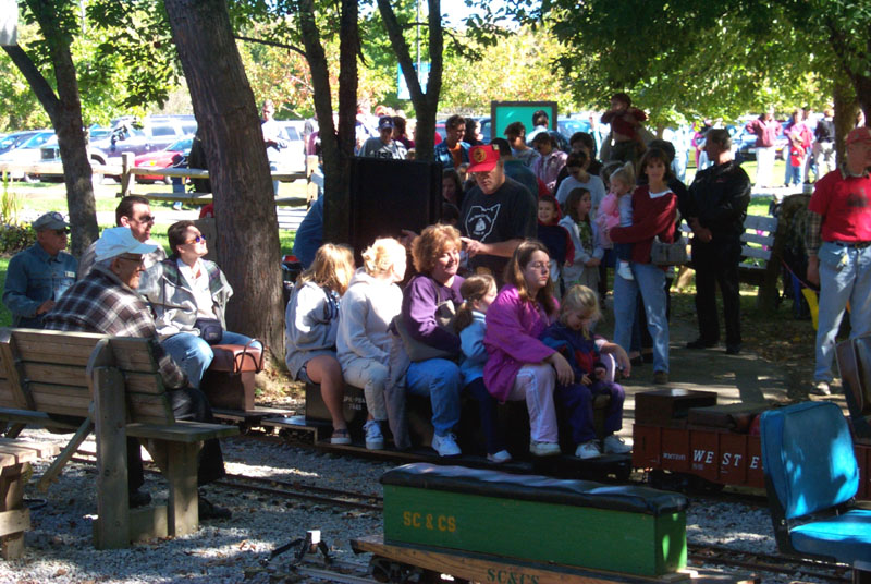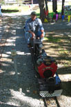 Bill Deptowicz leaving the station with a full load of passengers as George pulls up for the next load. The delight in a child's eyes for the "big" kids and the little kids setting on the rail watching the trains |
