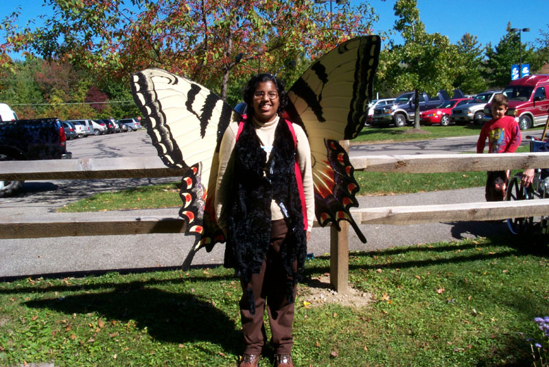 Roy watches as Don adjusts the seats for the riders. There were several park personel and volunteers that walked around with outfits with wings that represented butterflys and moths, quite impressive! |