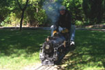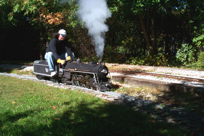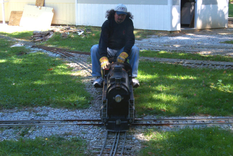 Frank Foti at the throttle of his newly acquired engine running on the "Orchard Loop" behind the station. Here you see a guy that is on cloud nine with a beautiful running engine. |