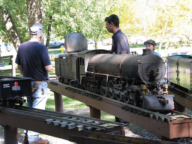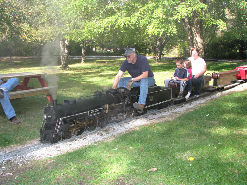 Josh Frank with Toby giving Edith Hacker a ride on the loop behind the station. Joe Laskowski with his interurban takes time out for the photographer to get this low angle shot. |