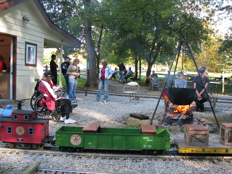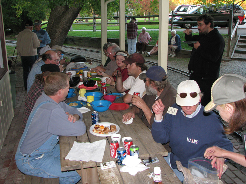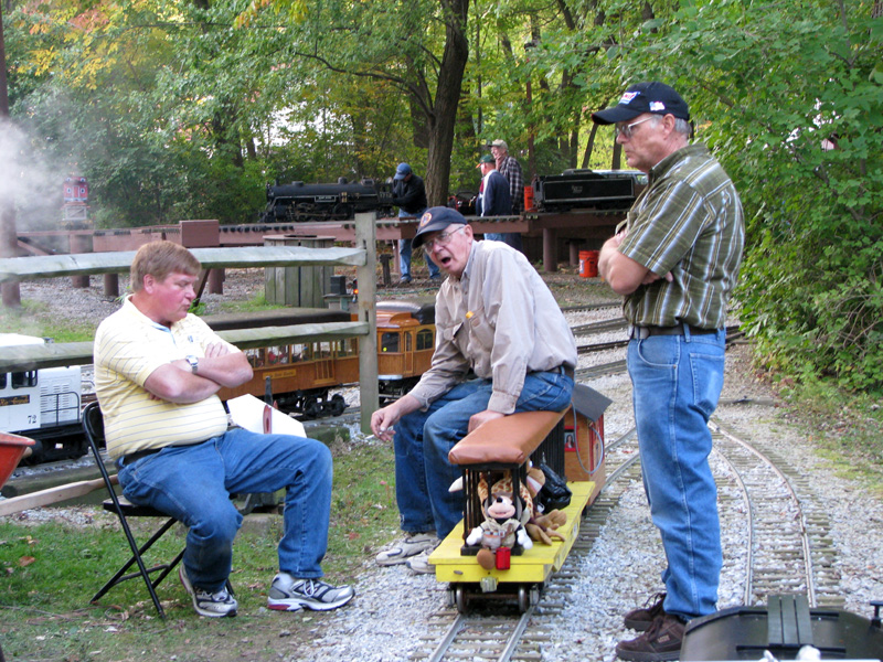 Mary Lou Schmidt is all smiles coming into the station with Mark Ross's gas powered Galloping Goose. Tom Reder, Trish and John Knootz enjoying a conversation with Lew Fowler as supper time draws near. |