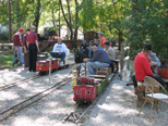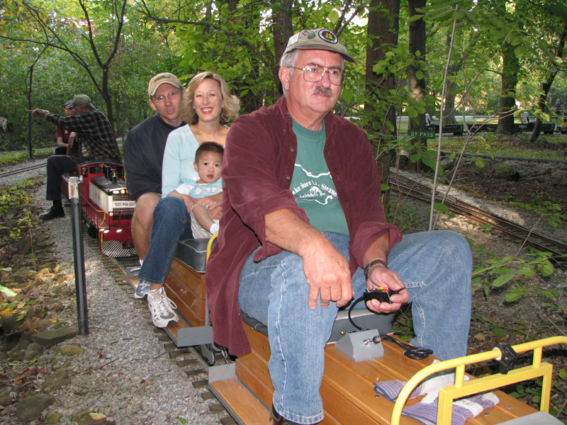 John Deptowicz approaching Horrendous from the other direction with his son Ethan and the Snoopy train. Back at the station two young timers, Harold Sicherman and Frank Russel behind him, watch the trains come into the station with some of the guests. |
