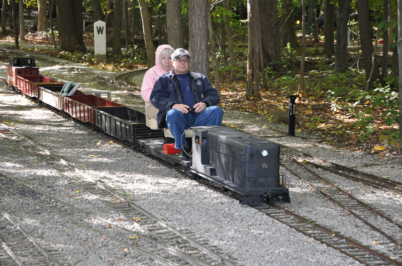Dave Woldman and Valerie Bilchak in conversation with Chris as he describes how he has four motors and four speed controllers for control of his engine. Dick Philpott at the controls of Joe Laskowski's interurban with Alex Bruchac as his passenger as they depart the station. |