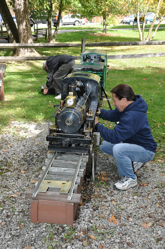 Bob Beardsley showed up with his Pennsylvania switcher and has it up on one of the steaming bays. Bob Beardsley Jr. brought his dad out and is helping him ready the engine for live steam running. |