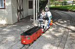 With two way running for the mode of operation today Paul Zorko is arriving back at the station with a guest on his Fireball Express. Chris Cooper with his wife Dena as they come back in to the station eastbound from their trip around the track. |