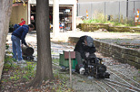 Bob steadies the car on the slight grade as his dad backs up the steamer to couple on to the car. Paul Zorko backs his train onto the Stanek Car Barn car lift and in the background the Snoopy train is getting readied to run. |