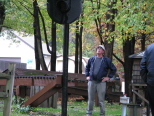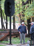 Bill Deptowicz looks up at the newly erected railroad signal light because we're going to have to open the case to wire it. Bill and Dick Clark discuss the ways that we can use the light for moving trains or just a decoration for the public. |