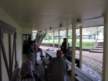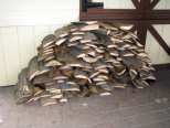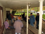 Wally Pausch brought in some slab wood so we would have dry wood for our Hobo Stew cookout over the fire. As it started to rain, the group began to gather at the station to wait out the rain. |