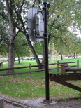 The rain continued and the guys are still waiting under the cover of the station roof. Bill snuck out when the rain let up enough to take a picture of the back side of the railroad signal which has a padlocked cover. |