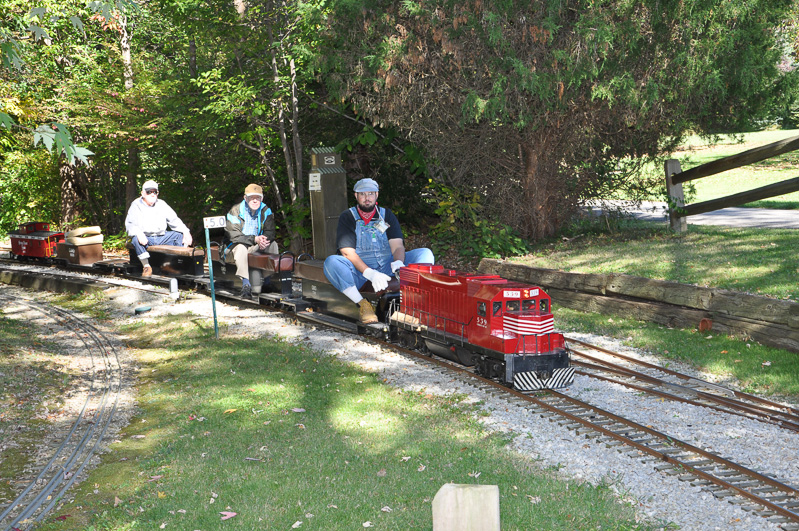 Amy, Ethan and John Deptowicz with the Snoopy train behind the station on the Orchard Loop. Ken with his electric powered Reading engine departs the station and gives a wave to the photographer. |