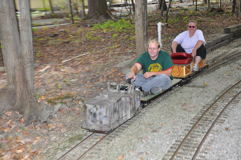 Dave adding cans of broth to the pot and hamming it up, with Robbi in the background. Dick Philpott taking some passengers for a ride passes through Drudgery with his electric powered Pennsylvania box cab that he built. |