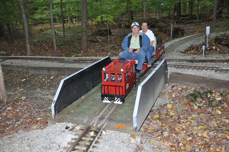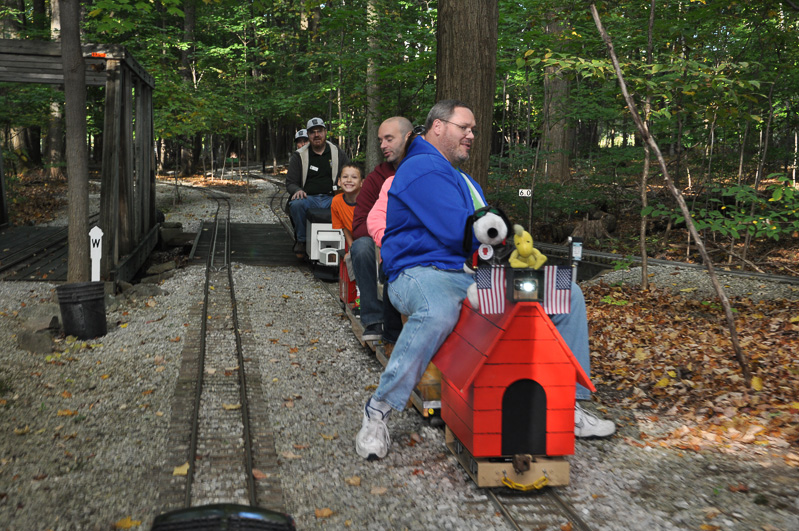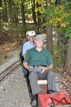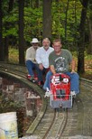 Ken passing over Patty's Rock Bridge with Robbi behind him and a full load of smiling passengers as they will start the grade up to High Creek. Ethan Deptowicz is all smiles as he passes over the Patty's Rock Bridge as engineer of the Snoopy train with his dad, John, behind him. |