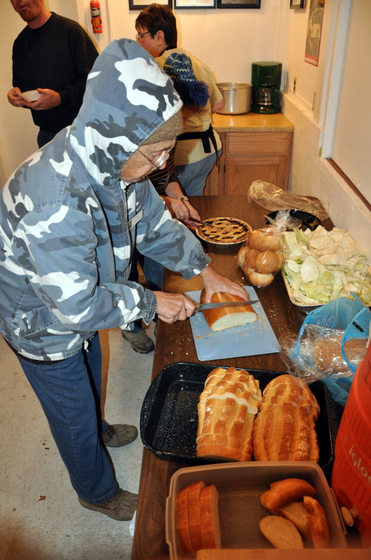 As Judy Oscker gets herself a cup of coffee, Kitty explains she has a bunch of coats, hoodies and T-shirts that she would like the members to look at and purchase. In the kitchen, Marie Nyland is helping out with cutting the bread in preparation to the meal being served shortly. |