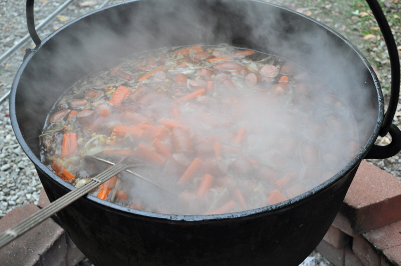 Robbi explains to the crew and guest her magic ingredient which will help thicken up the hobo stew which is instant potato flakes. A view into the cauldron with the sausage, carrots and cabbage floating around the top. |