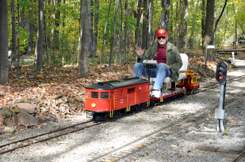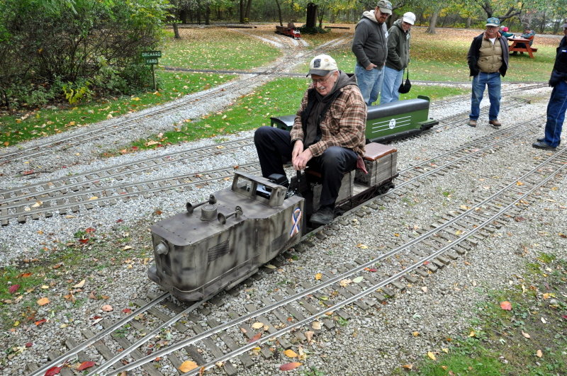 George goes over the controls of his Army train in the Orchard Yard with Bob Pakeltis , as Bob prepares to take it out on the mainline for a run. Joe with his interurban gives a wave after having just cleared the the block at the beginning of Horrendous and will soon be heading down grade at Filmor. |