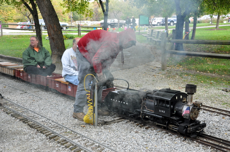 Dave Foster showing how to use finesse to cook the meat so that doesn't burn it as he browns it in the pot. Up at the steaming bays Frank Foti is firing up East Wind, his Pacific steam engine, as Paul Zorko and Bonnie Zaken watch. |