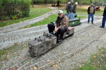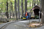 Kenny coming out of our Covered Bridge with Lew Fowler riding behind him as they take the gentle grade up to Zip Junction. Back at the station Dick Philpott talks with Kenny about changes he would like to make to the engine this winter. |