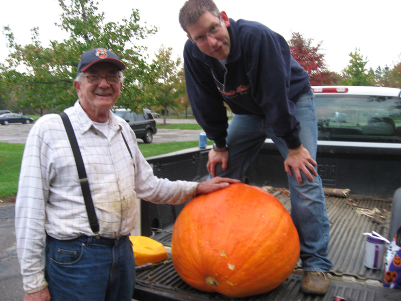 Another shot but this time with the flash to capture the scene. Paul Emch and Karl Losely carry the big pumpkin into the station to store it till Friday as it is too big to clear the other cars in the storage barn. |