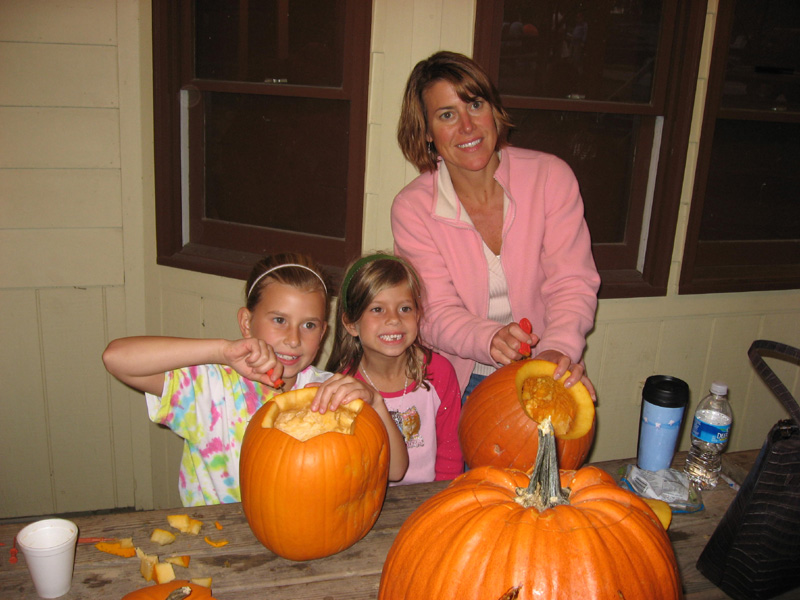 Nancy Kuchta (at left) who won the afghan in a drawing we had is helping Kitty Shriver hold it up for display. Sharon Warner and her daughter Eliza look over all the pumpkins we carved and set out for the train to pick up. |