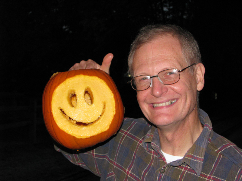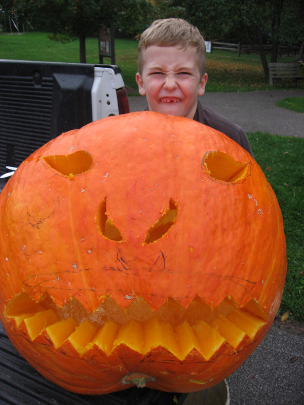Bridget trying her hand at carving a pumpkin as Marcel her hubby makes with an expression. A view of Jake as we look through the teeth of the huge pumpkin that dwarfs Jakes head. |