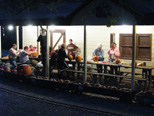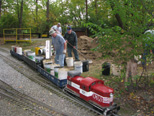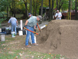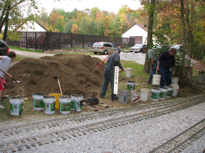 Tom, Lew and Ken doing what they can to reduce the size of the pile as Rick puts the loaded buckets on the train. This is the area that is being filled, as you can see, from the foreground to the wheelborrow. |