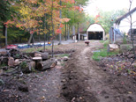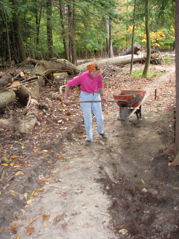 George Woodling taking the wheelborrow full of dirt to dump for fill about 30 yards behind him. Tom Reder, Ken Brooks, John Koontz and Rick Nagy work on our excavation of dirt for the new right-a-way to the storage building. |