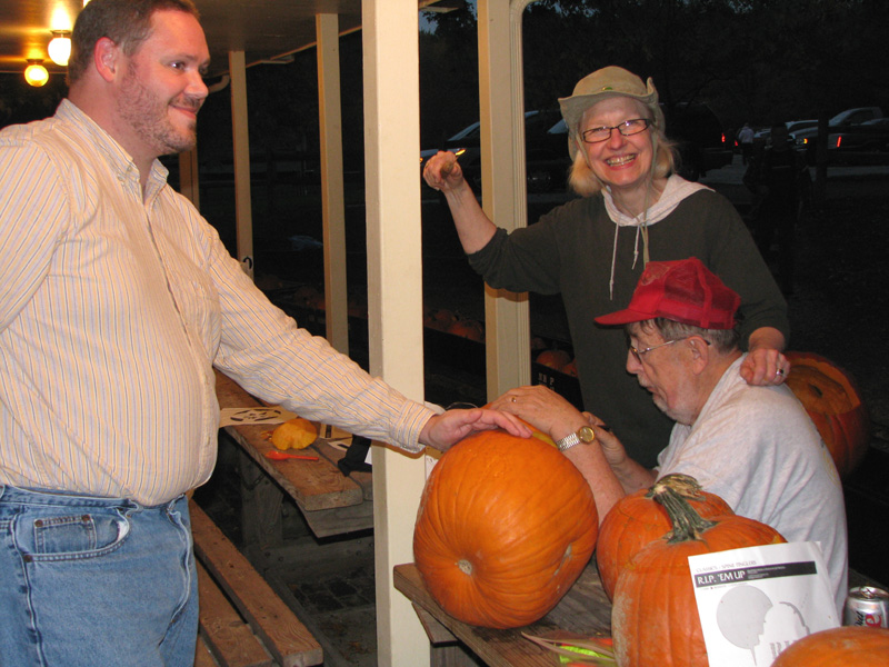 Kate Uhrich and John McDonald work on their pumpkins as Ryan Lawrence shows his talent for the CSX Railroad. Amy and John work on their pumpkins as Logan watches the train loading the carved specimens. |