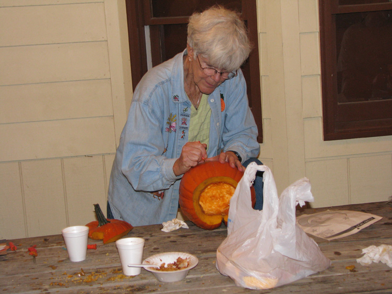 Logan is filling the bucket with seeds for mom to wash and roast as Edith Hacker watches the activity. Well it had to happen, we got another pouring rain after dark before we managed to carve all the pumpkins. |