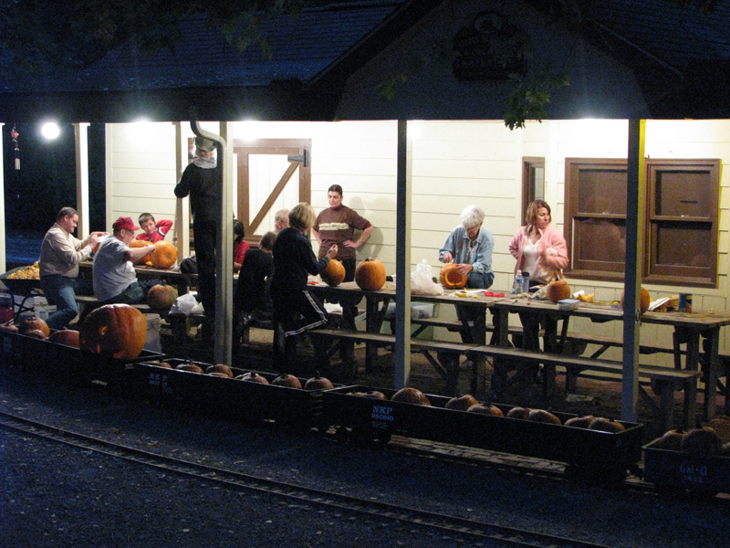 Kitty intensely at work on her masterpiece of carving. A night shot of the activity with all the carving going on and the trainload of pumpkins in front of the station. |