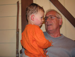Ethan Deptowicz just woke up and doesn't know what's going on as his Grampa holds him. With his grandson Patrick Bell sitting in front of him, Jerry Bell works on making a relief carving that will glow from the light within later. |