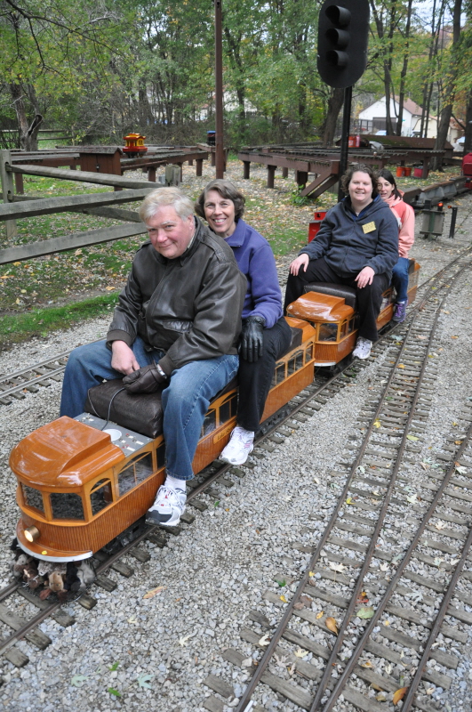 John Koontz at the controls of the interurbans with his wife, Trish and Colleen and Amy on the second car as they come into the station eastbound. Trish's artful construction of rainbow Jello into an engine design. |