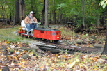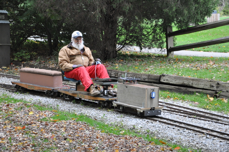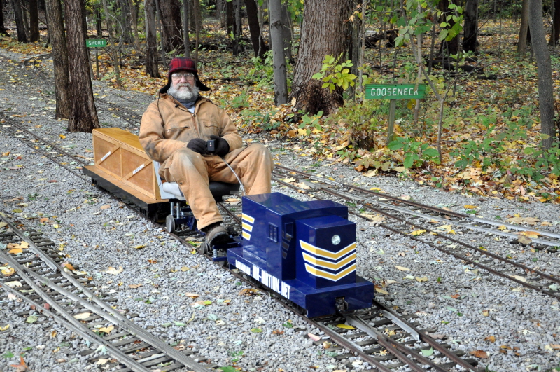 Using Plum Cove powered drives and wheels, Judson Elliott is building this engine and is enjoying the shake-down runs as he comes in to the station. The guys watch as Dick departs the station with his SW1500 and Jonathan as his only rider -- it's cool out in those woods. |